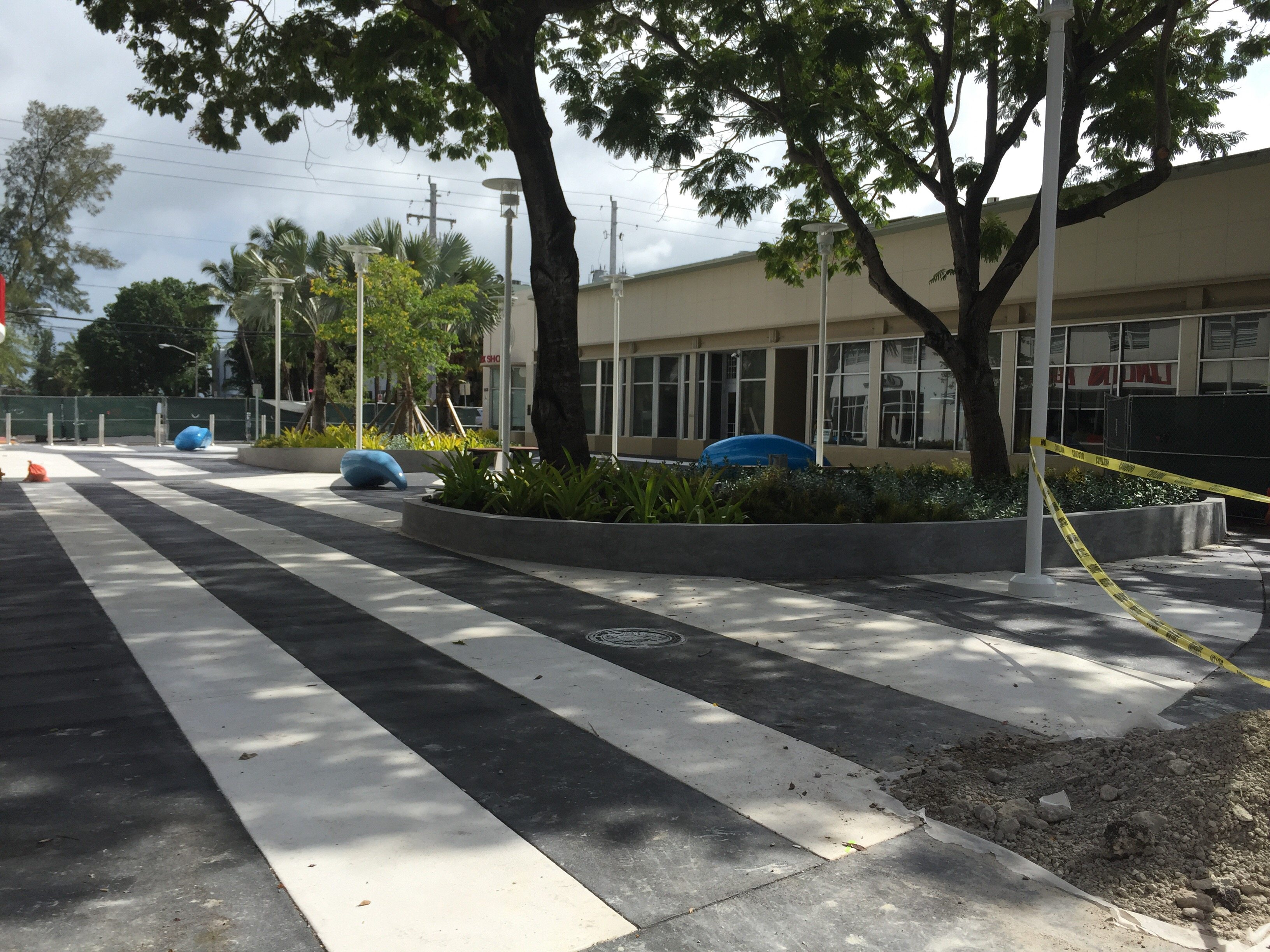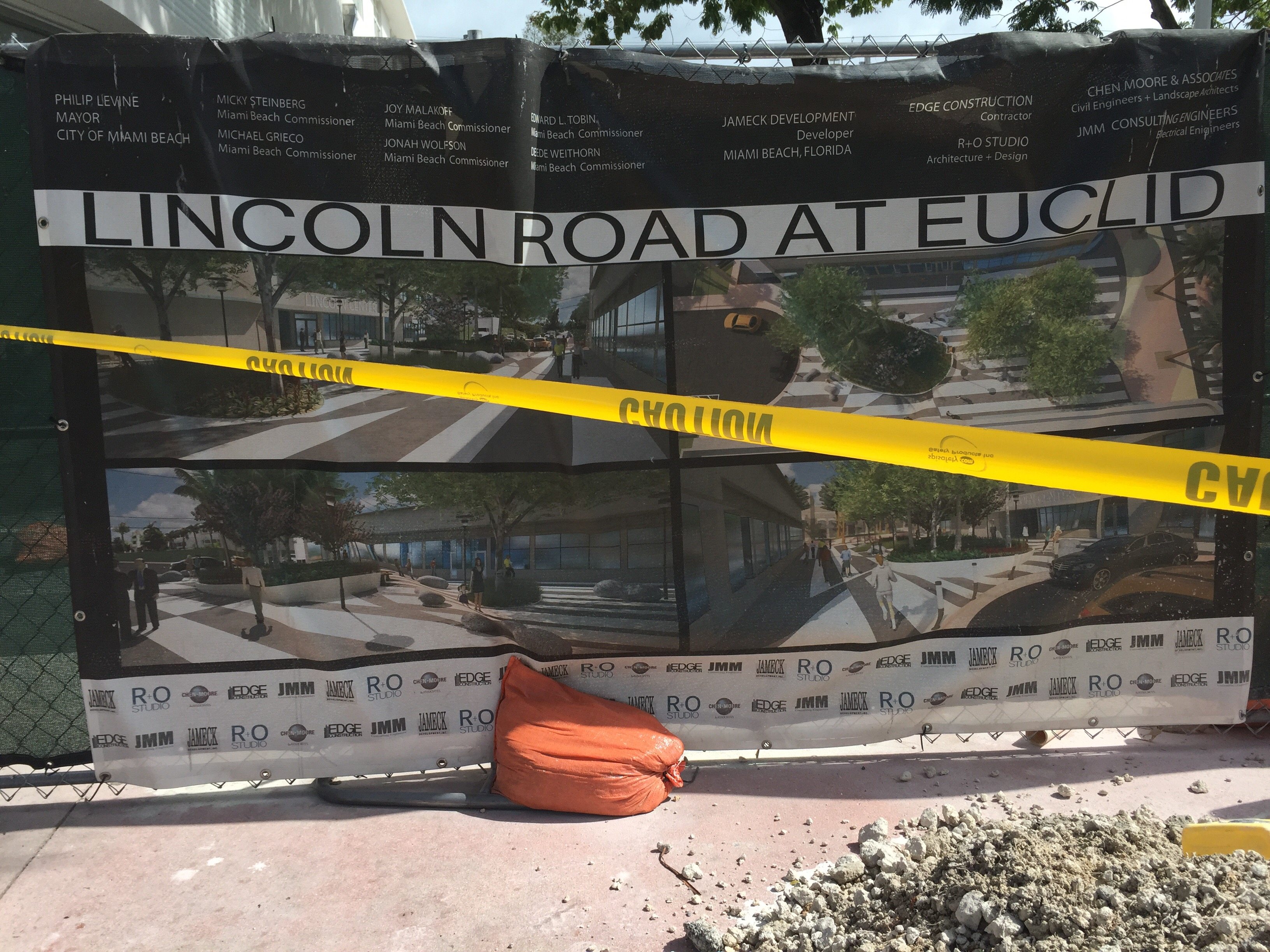 Continuing our stroll down Lincoln Road to Euclid Avenue, the dead end has been closed off by construction fencing for a while now for work that appears to be almost finished. This is a small expansion of Lincoln Road’s pedestrian area, with new seating elements and greenery. Although this project is unrelated to the much more extensive renovations planned for Lincoln in the coming years, think of it as a taste of what’s to come.