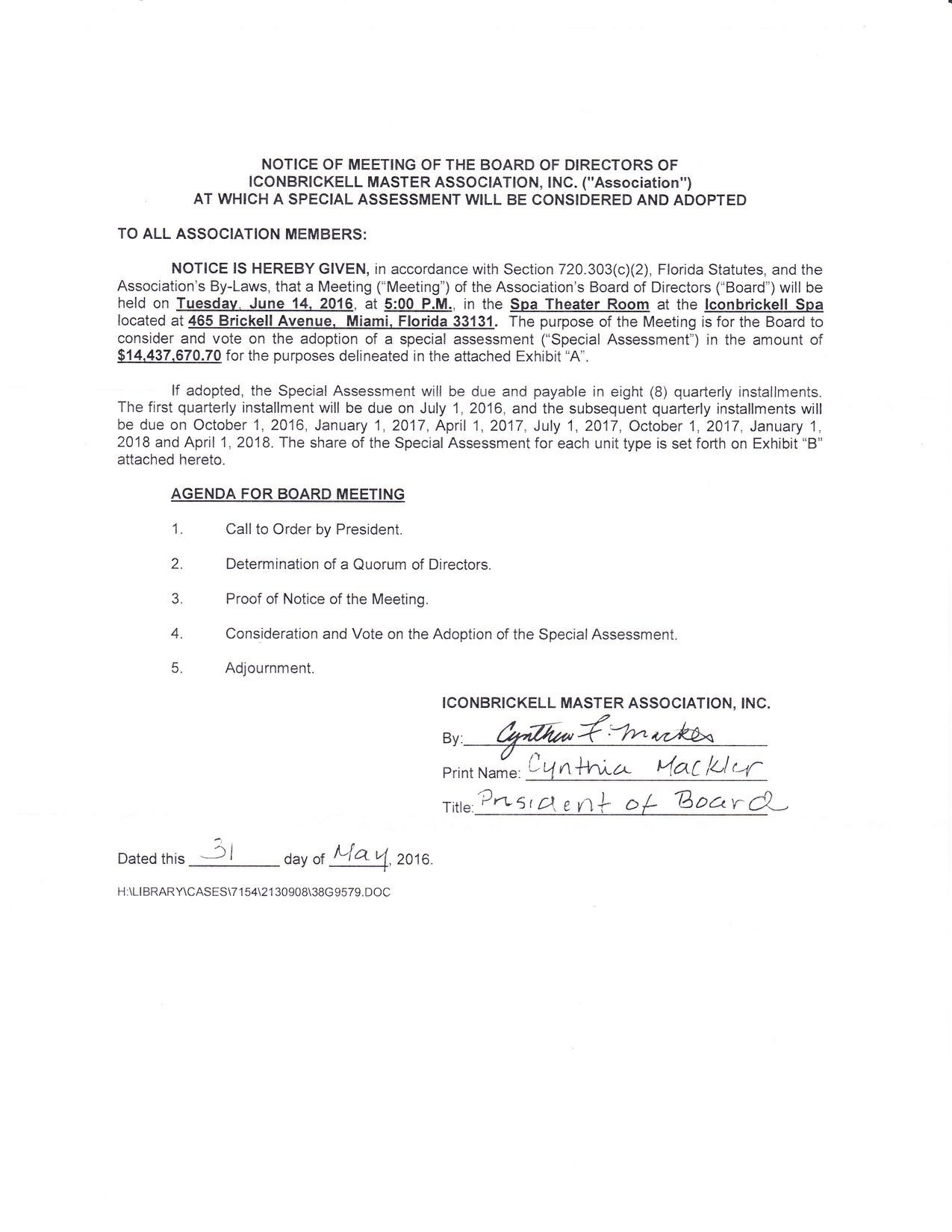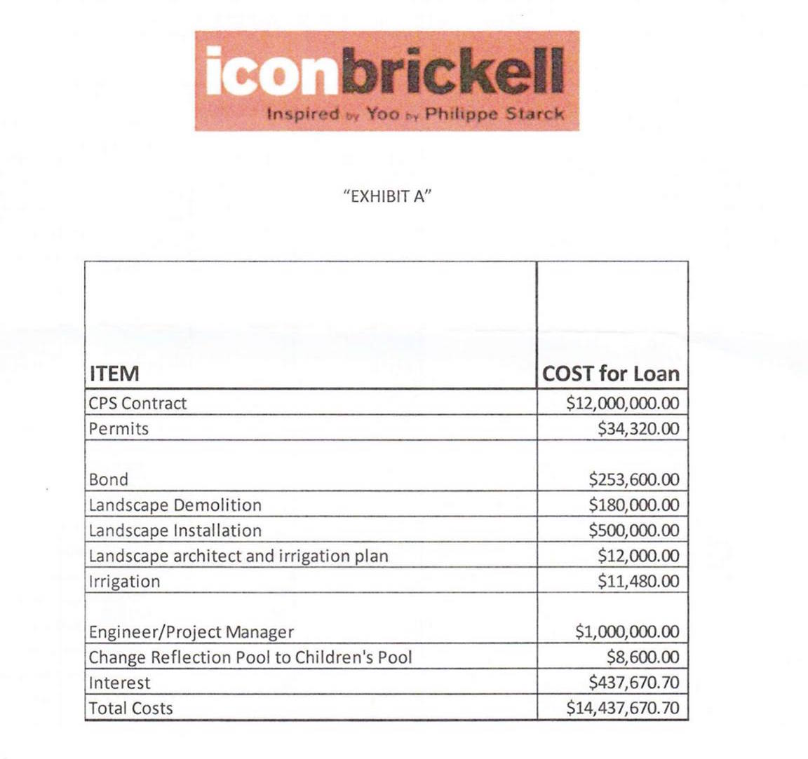 The Icon Brickell Master Association sent out a letter to ‘All Association Members,’ meaning every owner in the three-towered colossus, to lay out how much each is expected to pay, broken down per unit, for the repair and replacement of Icon Brickell’s poorly constructed pool. The cost of the entire $14 million project is being split up among the development’s 1,718 total units, the newly rebranded W Hotel, and even (from the looks of it) the restaurants, proportional to each owner’s percentage ownership of the development. This breaks down the amount of the special assessment to thousands of dollars for a typical unit, but not tens of thousands. Reasonable? The association is set to vote on the special assessment on 14th.