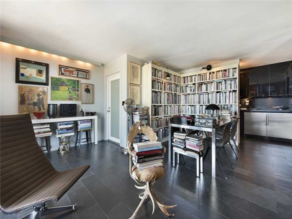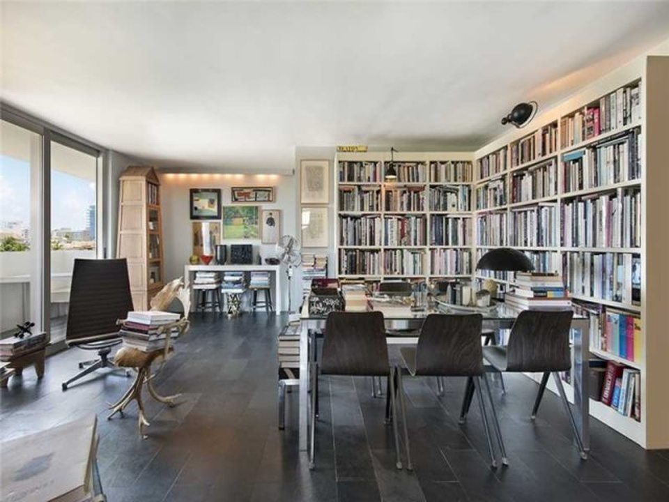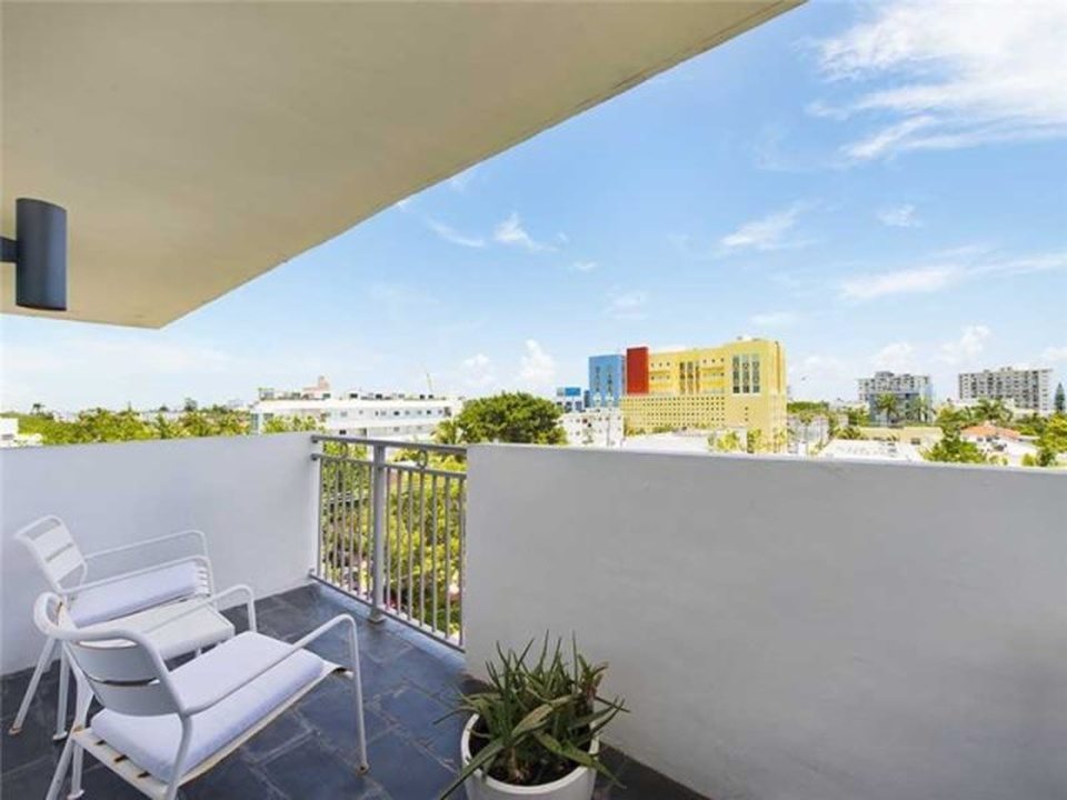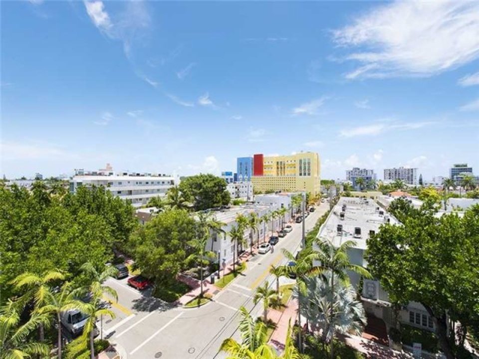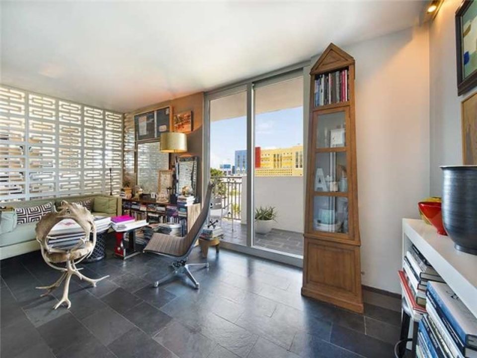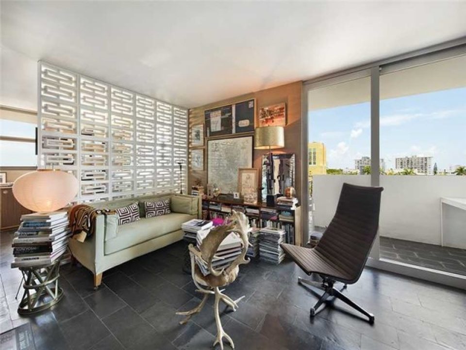 “Manhattan meets Miami” is how the broker describes this gorgeous little condo in a postwar (built 1969, summer of love) condo building South-of-Fifth. Okay, yes, it’s kind of Manhattan-ish in its petite size and the fact it’s not covered in palm tree prints, but it’s also just very tastefully done, and resourcefully done too. The NE facing unit at 360 Meridian Avenue, with expansive views just over the tree line, is listed for $330,000. In 588 square feet, this apartment is very nicely kitted out, with a separate sleeping area partitioned by concrete block, a kitchen hidden behind an extensive bookcase, a large dining room table, and a couch near the balcony.