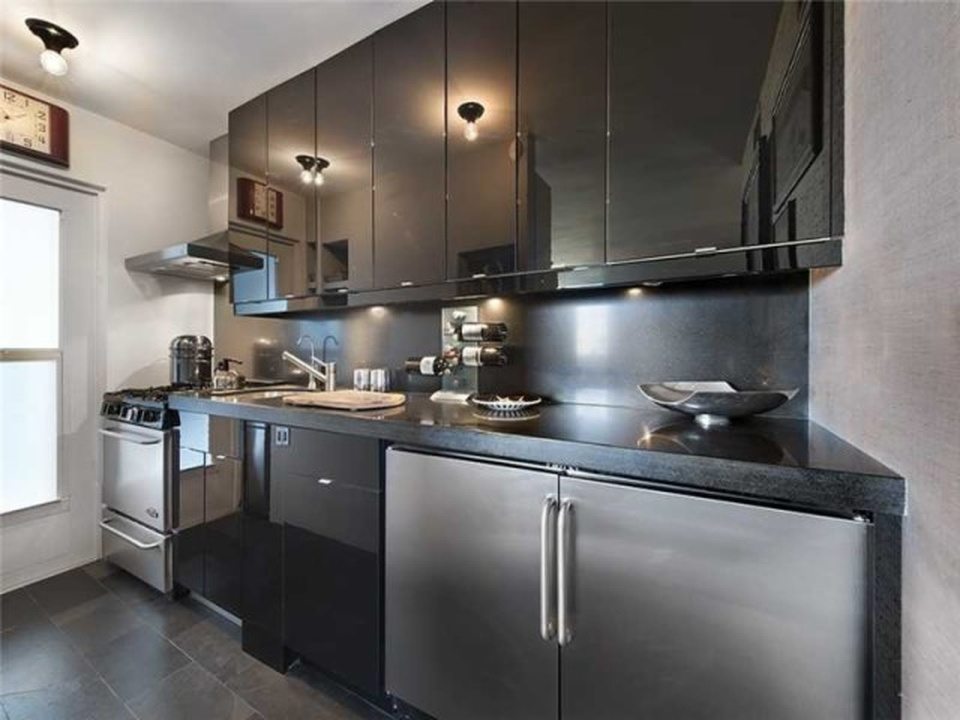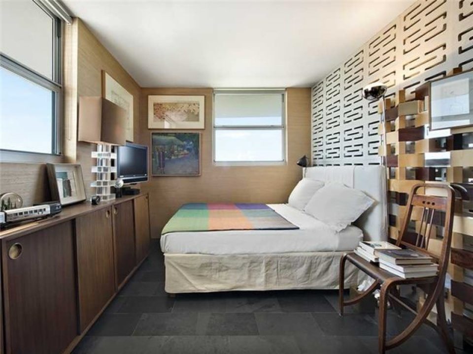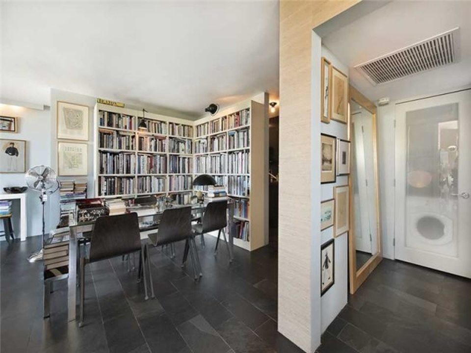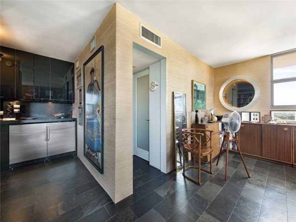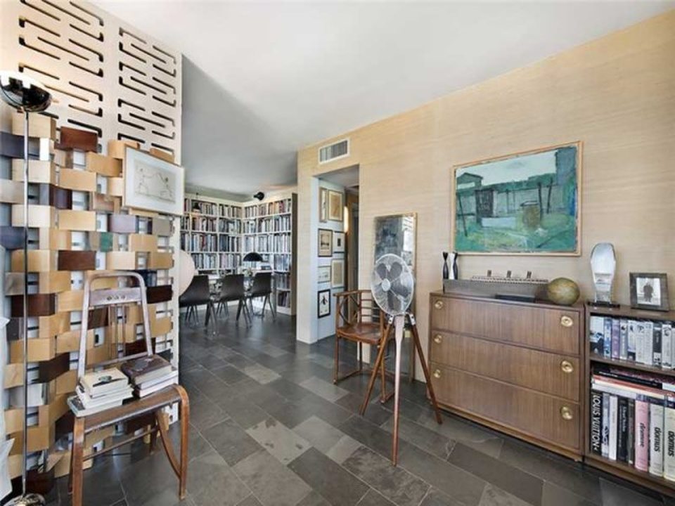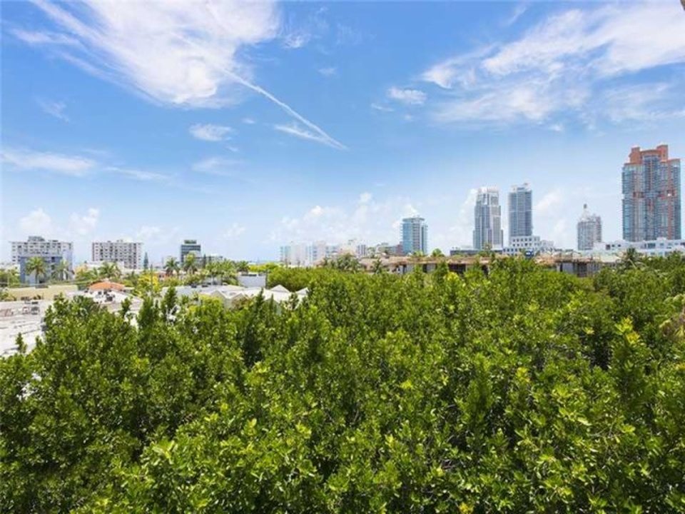 “Manhattan meets Miami” is how the broker describes this gorgeous little condo in a postwar (built 1969, summer of love) condo building South-of-Fifth. Okay, yes, it’s kind of Manhattan-ish in its petite size and the fact it’s not covered in palm tree prints, but it’s also just very tastefully done, and resourcefully done too. The NE facing unit at 360 Meridian Avenue, with expansive views just over the tree line, is listed for $330,000. In 588 square feet, this apartment is very nicely kitted out, with a separate sleeping area partitioned by concrete block, a kitchen hidden behind an extensive bookcase, a large dining room table, and a couch near the balcony.