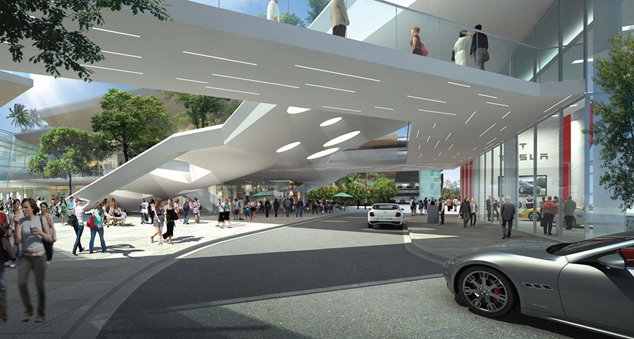 The design of the new wing has been completely transformed compared to earlier schematics, which were of a much simpler enclosed mall layout, with skylights and an exterior oriented toward a new garage and various driveways. The new plan, by architect Carlos Zapata, is sleek, steely, and futuristic, with flying cantilevered awnings shooting out at jaunty angles, tons of glass, high ceilings, and a completely outward orientation. Shoppers stroll on bridges spanning a lower shopping area with a driveway artfully cut through. An exterior court ringed with shops and restaurants is the futuristic counterweight to Aventura Mall’s more traditional piazza area. That outdoor space, near Cheesecake Factory and the movie theater, has sunny pink stucco, Spanish tiles everywhere, terra-cotta barrel tiles on the roof, and an aqua blue statue of seahorses holding up some kind of orb.