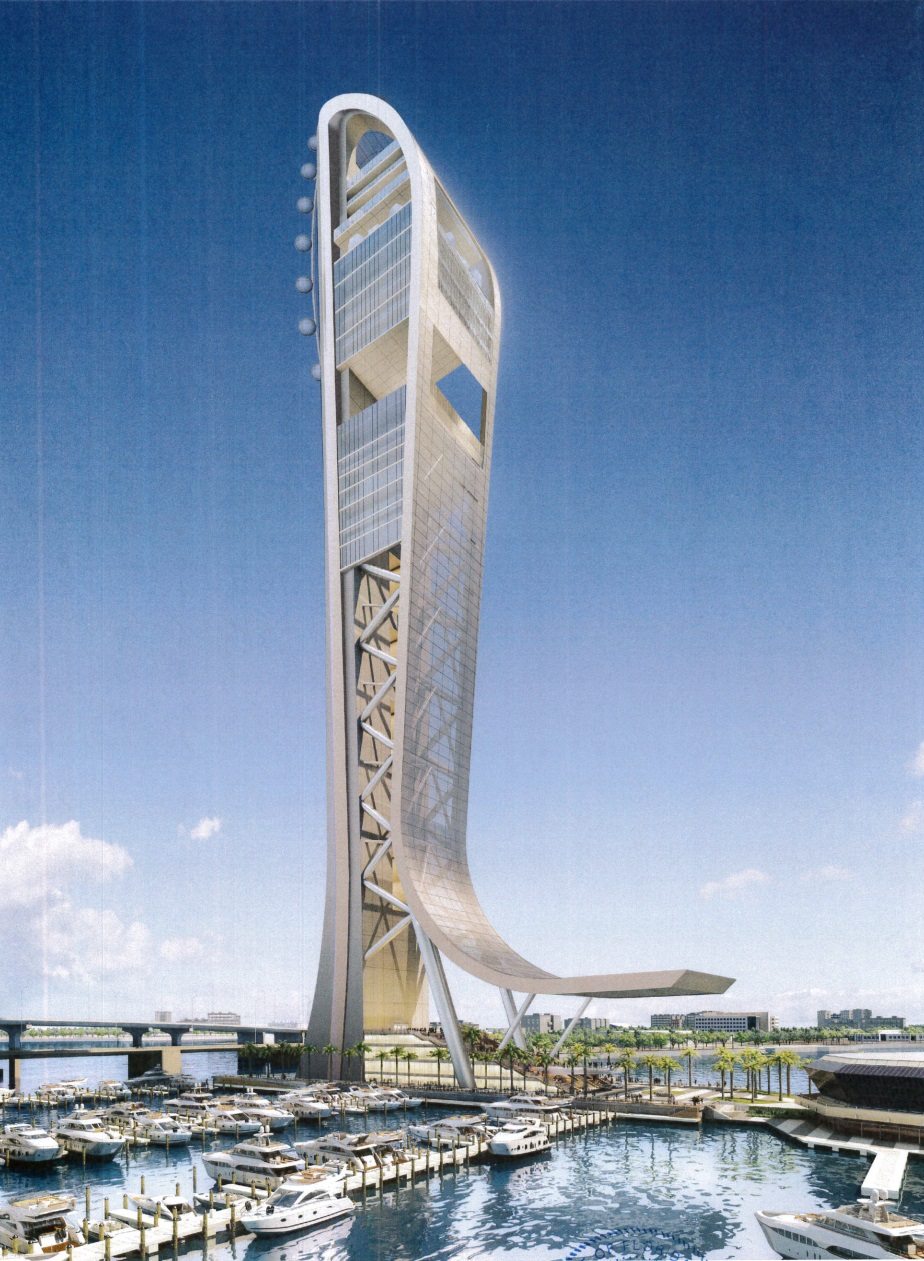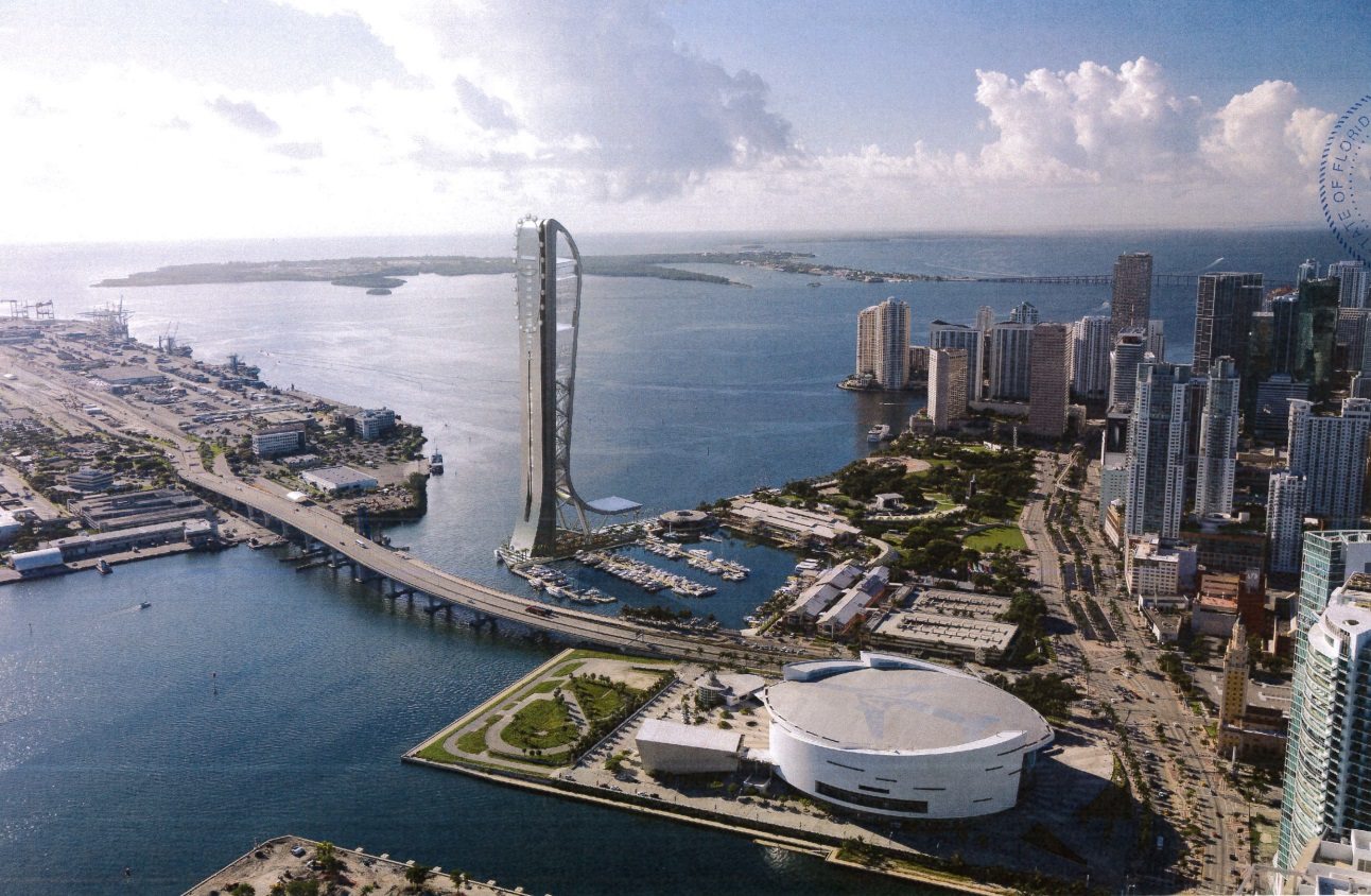 When and if SkyRise Miami eventually gets built, the observation tower and vertical amusement park above Biscayne Bay in Downtown Miami might have two new additions: a ‘giant observation wheel’ and ‘giant chair drop’ according to modified plans submitted to the City of Miami Planning Department for approval. The Next Miami acquired a copy of those plans and renderings, unrealistically showing sort of a pill-shaped oval of little pods discretely orbiting around the back of the tower. Ridiculous rendering alert! It could actually be pretty awesome, but come on bro, the engineering alone will make the ‘wheel’ a lot more noticeable than that ridiculous little fantasy chain of pearls. The finished product will probably look more like a bicycle wheel nailed to a stool (how Duchampian!) than that rendering. Hey, at least it won’t be so phallic anymore.